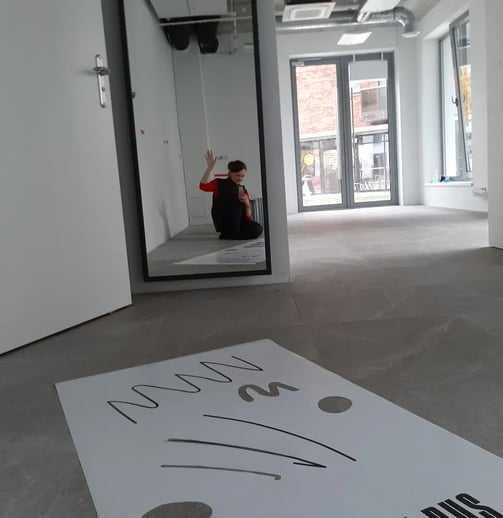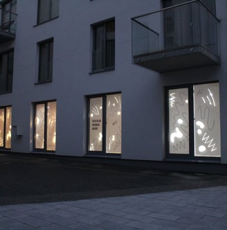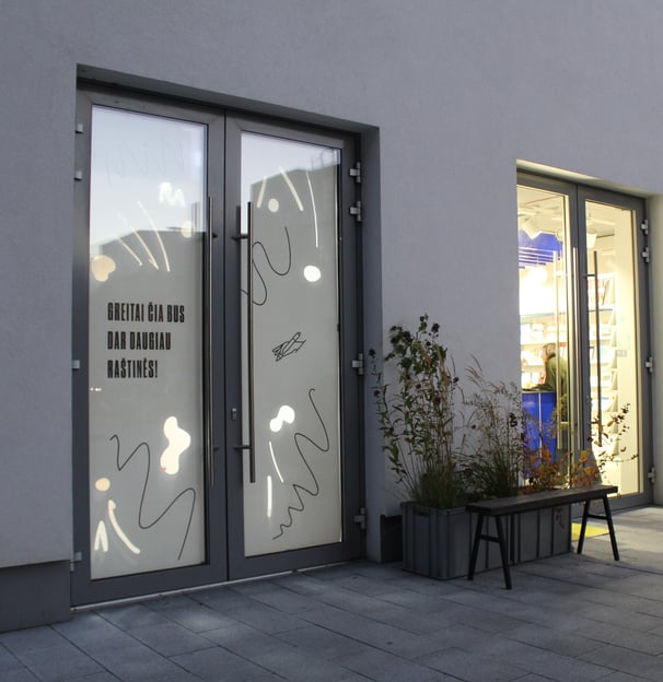 As Raštinė cafe decided to expand their space I made window covers to keep a surprise and dusty process hidden inside but with a possibility for curious passers by to have a sneak peak inside.