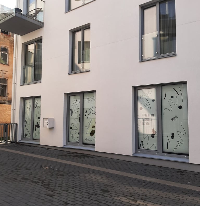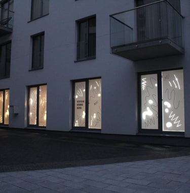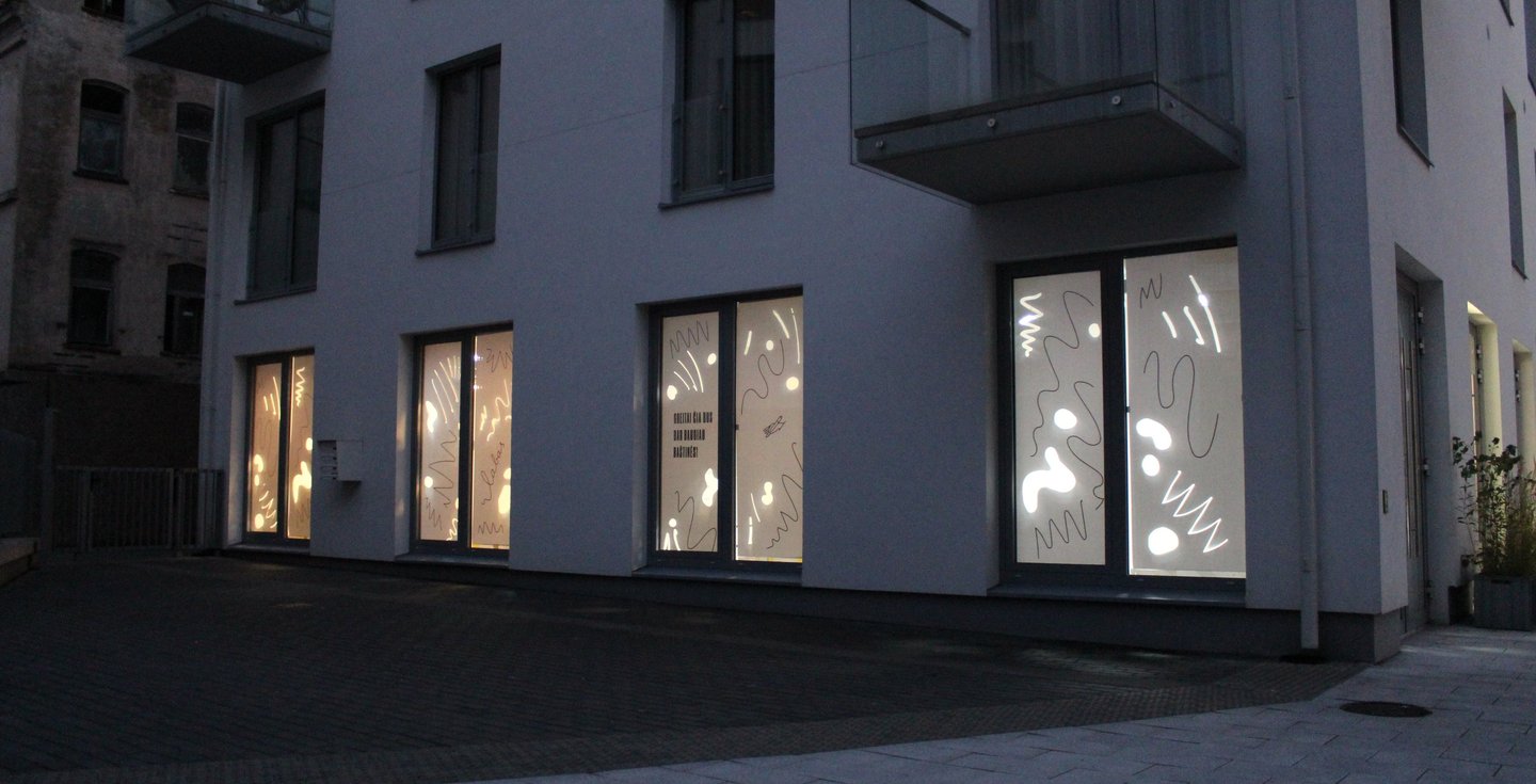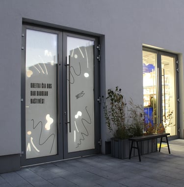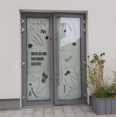 As Raštinė cafe decided to expand their space I made window covers to keep a surprise and dusty process hidden inside but with a possibility for curious passers by to have a sneak peak inside.